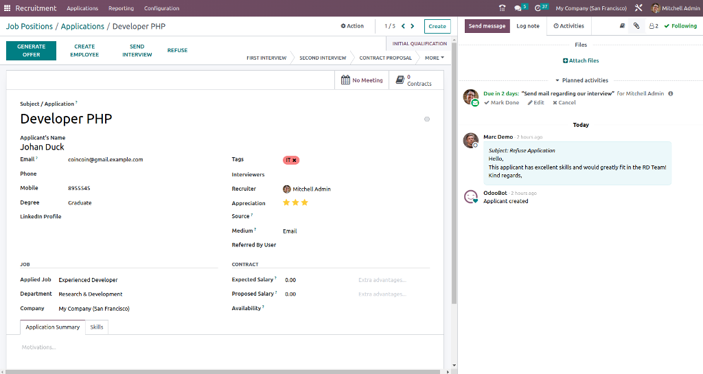 - Antwortmöglichkeit per E-Mail für den Bewerber an Odoo und darüber wiederum an den Verantwortlichen für diese Stelle