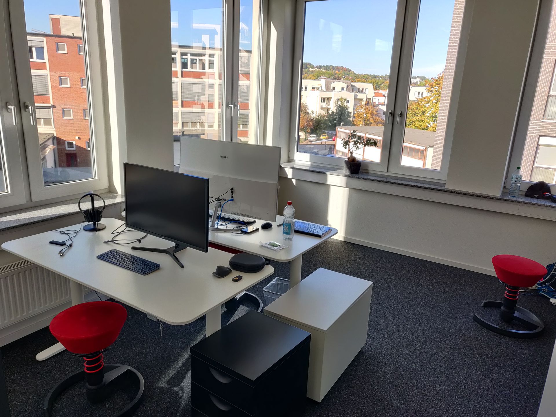 Elektrisch verstellbare Stehtische, eigenes Notebook, WIFI6, Softphone, Bluetooth-Headset und vieles mehr.