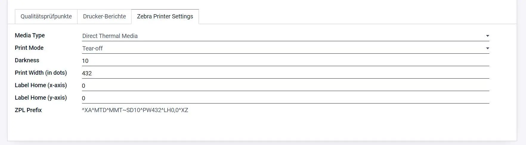 Konfigurationseinstellungen, inklusive Media Type, Print Mode, Darkness, Print Width, ZPL Prefix