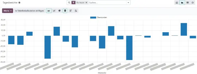 Über ein Dashboard kann jeder Mitarbeiter seine eigenen Tagesberichte auswerten und hat zu jeder Zeit Einblick in seine Überstunden. Als Personalmanager bekommt man sogar eine Gesamtübersicht zur Belegschaft.