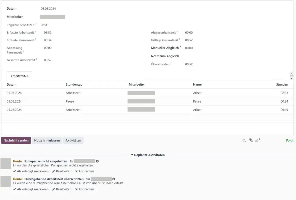 In Tagesberichten werden Arbeitszeiten und Pausenzeiten dokumentiert, inklusive Aktivitäten für den Personalmanager oder den Mitarbeiter, wenn die gesetzlichen Vorgaben nicht eingehalten werden.